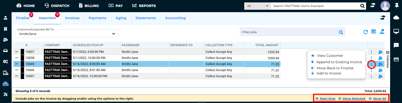 - Move to Assemble: Select the MOVE TO ASSEMBLE and the reservation will move to the ASSEMBLE tab to be invoiced later.