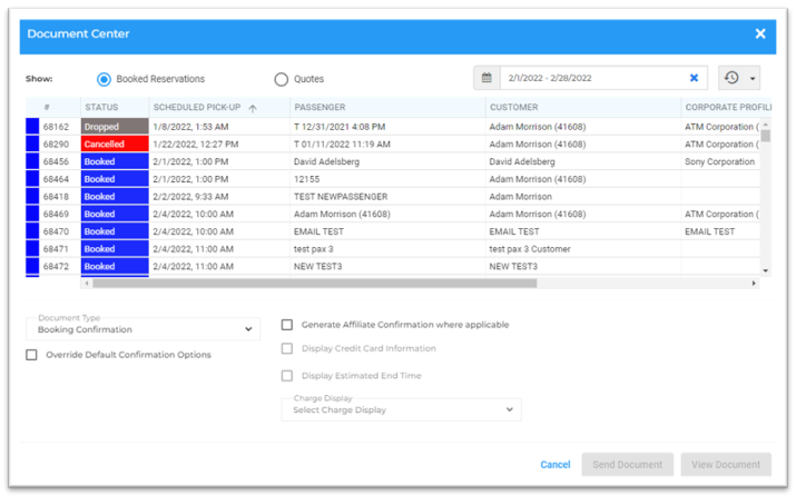When you have the reservation(s) documents selected and the appropriate options selected, you can use the View or Send option. (Use the drop down list to select the type of document you are trying to view, print or email.)