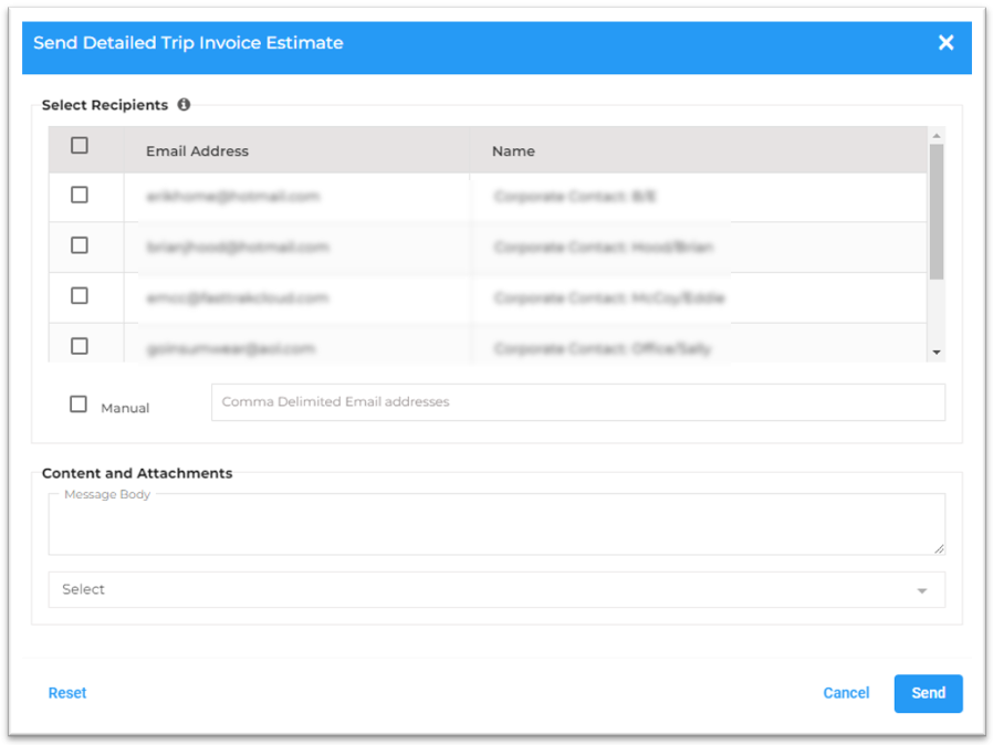 Send Document opens the send document form which allows you to set specify details for the send operation. Select one or more recipients from the list by checking the corresponding checkbox. You may also manually enter an email address to send to by checking the manual box and entering one or more comma email addresses separated by a comma