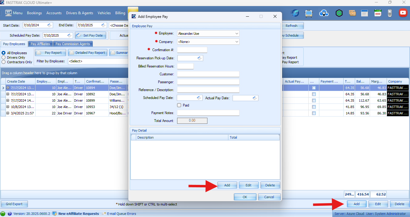 To ADD or EDIT existing pay after a job reservation has been completed go to the PAY section and select the appropriate tab (EMPLOYEE, AFFILIATE or COMMISSION).